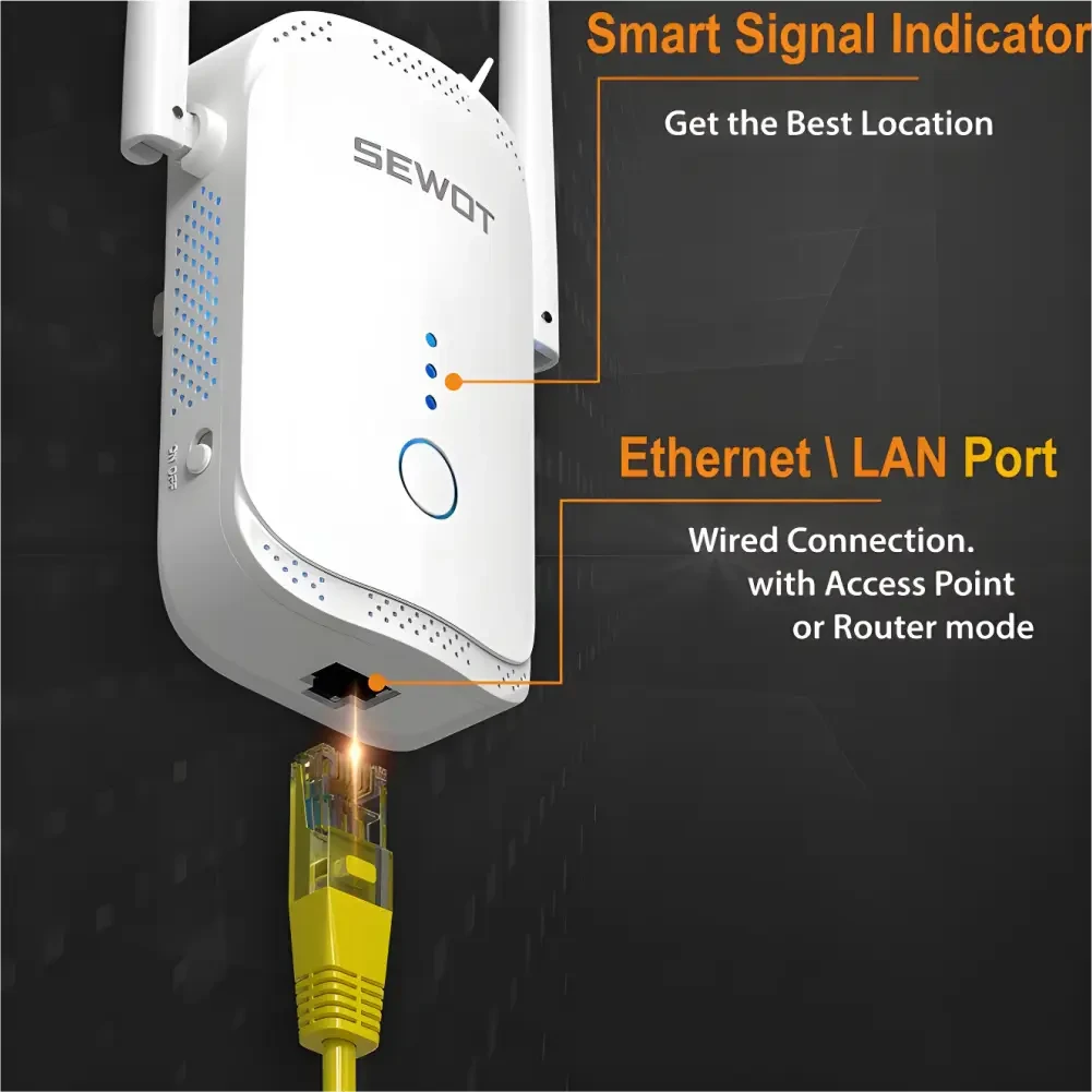 Boost your WiFi coverage with the SEWOT WiFi Extend, a powerful, easy-to-install range extender that eliminates dead zones and extends your WiFi signal to every corner of your home. Enjoy fast, reliable connections for streaming, gaming, and browsing with speeds up to 1200 Mbps, dual-band support, and compatibility with all standard routers. Specifications: